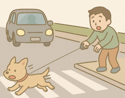 通常の固定リードであれば、犬が少しでも道路に向かって動いた瞬間に飼い主が引き寄せることができます。しかし伸縮リードでは、犬がすでに数メートル先に移動していることが多く、咄嗟に引き戻すのはほぼ不可能です。